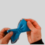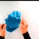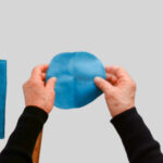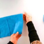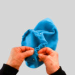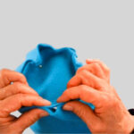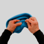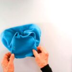1⃣ 裏側から、サイドをぬい合せた縫い目を、顔周りの縁を縫った縫い目から2cm上でつまんで折ります。