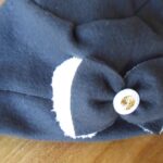 5⃣ キャップの適当な位置にリボンを縫い付けてとめる。